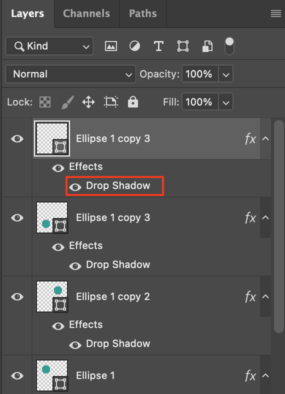 그다음 패널에서 하나의 레이어를 임의로 선택한 다음, Drop Shadow 효과를 더블클릭해서 레이어 스타일(Layer Style) 설정창을 연다.