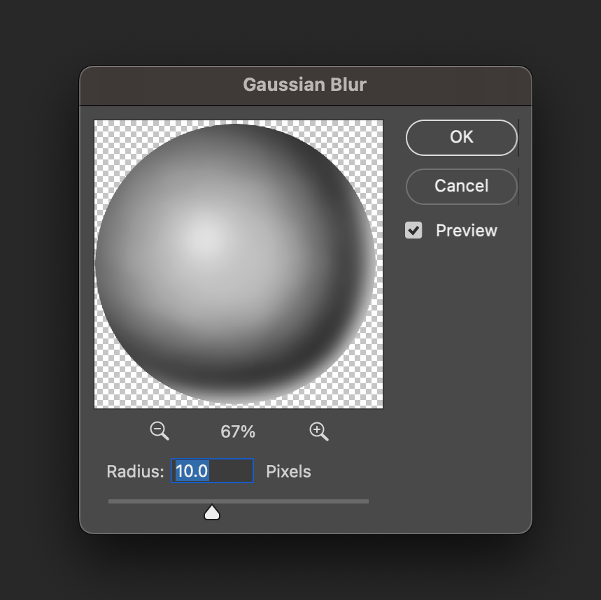 7. Filter 메뉴 > Blur > 가우시안 블러(Gaussian Blur)를 선택한 뒤, 10px 정도를 적용해서 원의 표면을 매끈하게 만들어 준다.