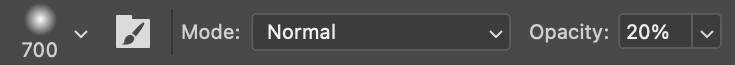 3. 브러시(Brush tool)를 선택하고 소프트 라운드 브러시(Soft Round Brush), 사이즈 700, 투명도(Opacity) 20%로 설정한다. 컬러는 검은색(#000000)으로 설정한다.
