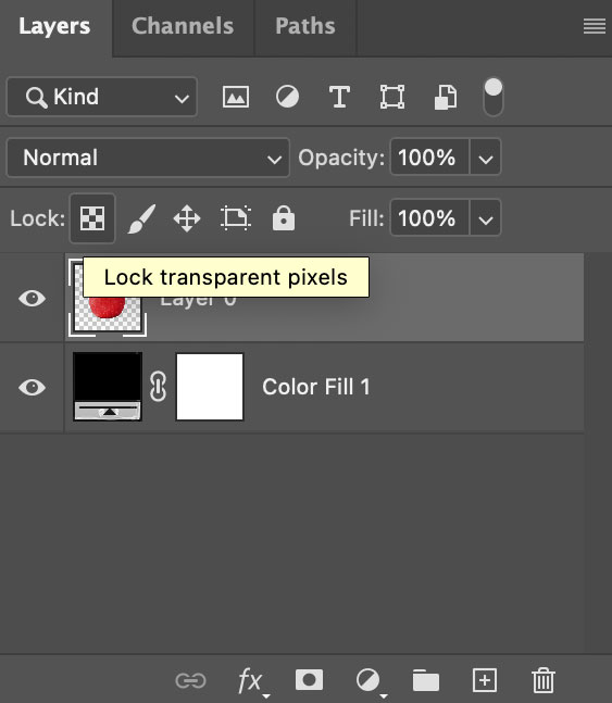 포토샵 레이어 패널 상단에 보면 투명픽셀 잠금(Lock transparent pixels) 아이콘이 존재한다. 해당 버튼을 누르면 적용되는 레이어에 자물쇠 아이콘이 표시되며, 레이어의 투명한 영역에 마스크가 적용된다. 즉, 투명픽셀이 잠긴 상태에서 브러시를 사용하게 되면 픽셀이 존재하는 영역에만 페인트 효과가 적용된다.