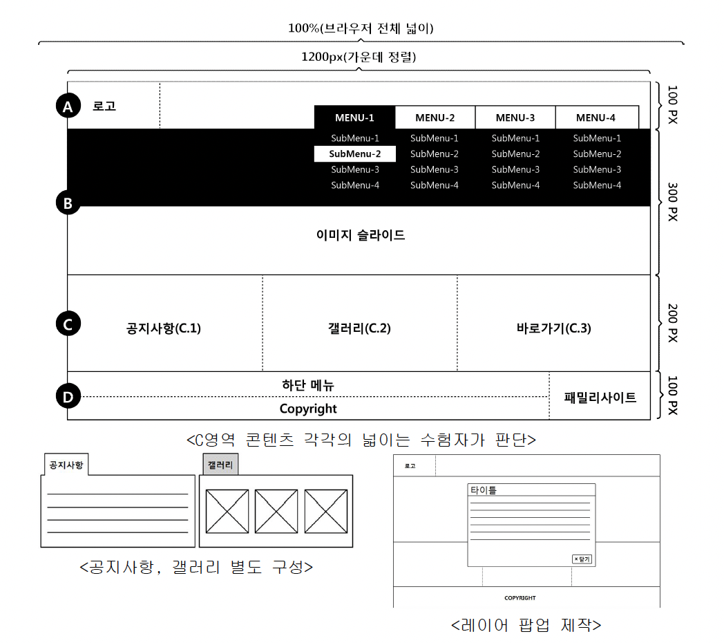 HTML과 CSS를 추가로 작성해서 와이퍼프레임 구조를 아래와 같이 완성한다: