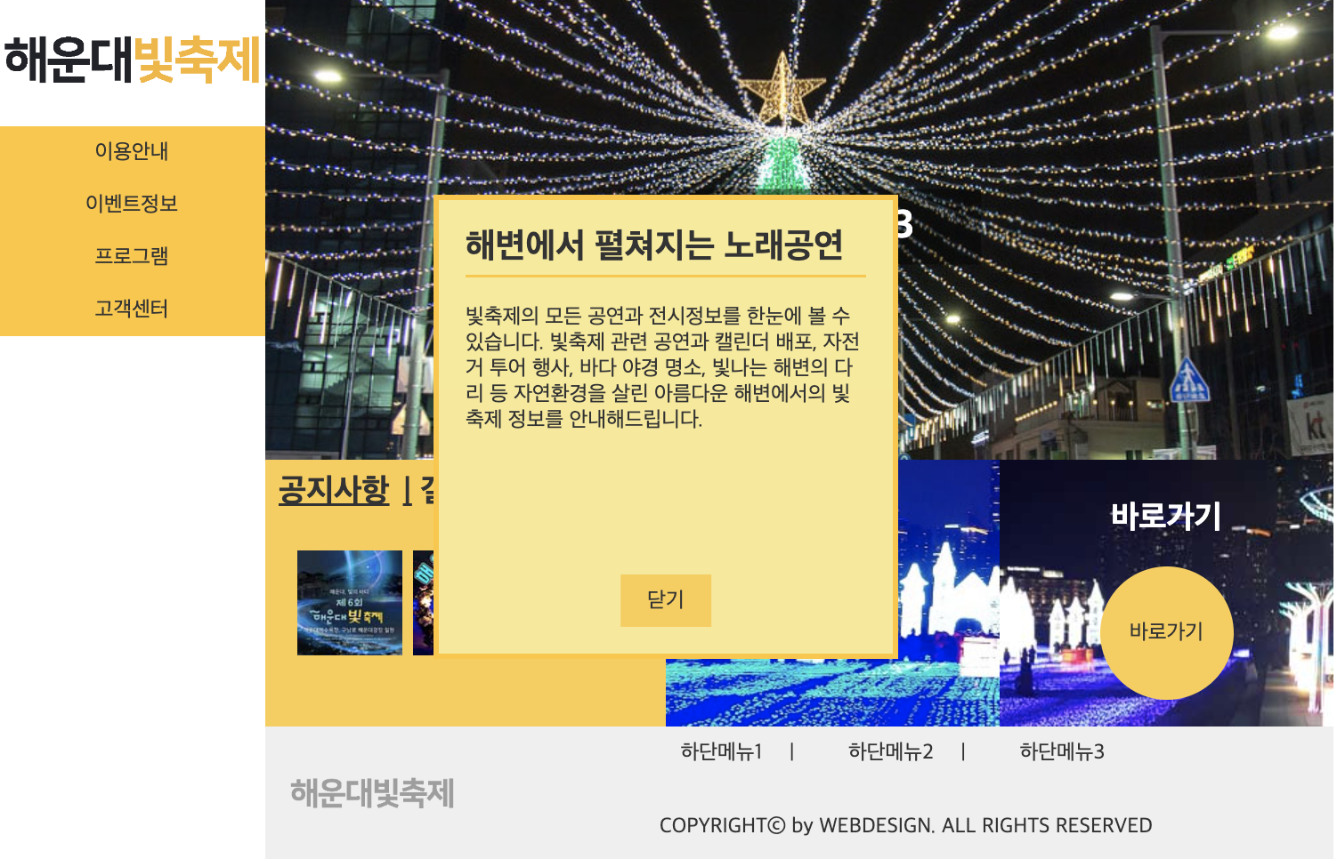 빛축제의 모든 공연과 전시정보를 한눈에 볼 수 있습니다. 빛축제 관련 공연과 캘린더 배포, 자전거 투어 행사, 바다 야경 명소, 빛나는 해변의 다리 등 자연환경을 살린 아름다운 해변에서의 빛축제 정보를 안내해드립니다.
